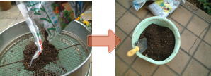 ・用土と堆肥を2:1くらいの割合で混ぜふるいかける。※空気を含ませ、まんべんよくかき混ぜる